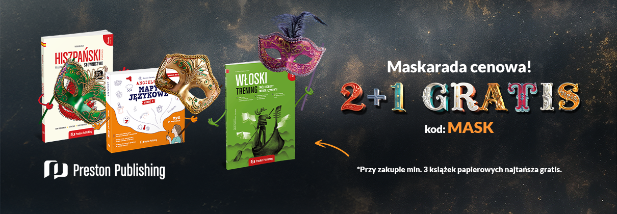 W księgarni językowej online znajdziesz książki do nauki w papierowej formie. Zostały one zaprojektowane w taki sposób, aby umożliwić Ci tworzenie własnych notatek, tłumaczenie na bieżąco słownictwa i sprawne rozwiązywanie zadań. Dysponujemy również bogatą ofertą e-booków i mini e-booków oraz zestawami książek tradycyjnych i elektronicznych. Aby dowiedzieć się więcej o ofercie internetowej księgarni językowej i stosowanych przez nasze wydawnictwo metodach nauczania, odwiedź zakładkę Jak się uczyć? oraz prowadzonego przez nas bloga. Znajdziesz tam informacje na temat zawartości podręczników oraz praktyczne wskazówki, które przydadzą się w nauce obcego języka. Nauka akcentów, poprawnej wymowy i rozumienia ze słuchu jest bardzo ważnym elementem rozwijania znajomości języka. Aby forma ćwiczeń była dla Ciebie efektywniejsza i bardziej urozmaicona, pobierz materiały MP3 do książek z księgarni językowej Preston Publishing. Jedno kliknięcie wystarczy, aby wszystkie potrzebne pliki mieć zawsze pod ręką – na swoim komputerze lub telefonie. Nasze kilkugodzinne kursy audio znacząco poprawią Twoją swobodę posługiwania się językiem – w sposób aktywny i bierny – i pozwolą Ci łatwiej osiągnąć kolejny poziom zaawansowania. Systematyczne ćwiczenia to gwarancja rozwoju językowych umiejętności, dlatego skorzystaj ze wszystkich oferowanych przez nas materiałów dostępnych przy zakupie podręcznika. Nauka języków obcych jest prawdziwym wyzwaniem. Wierzymy jednak, że odpowiednia metoda nauki, systematyczna praca i nacisk na poznawanie konstrukcji gramatycznych w rozmaitych kontekstach to klucz do sukcesu. Każdy nasz podręcznik jest zarazem kompletnym przewodnikiem po zagadnieniach gramatycznych wybranego języka obcego. Znajdziesz w nim nie tylko cenne wskazówki językowe, przydatne słownictwo i ciekawostki językowe, lecz także uwagi dotyczące najczęściej popełnianych błędów. Dzięki takim walorom książki pochodzące z internetowej księgarni językowej Preston Publishing śmiało można nazwać Twoim osobistym nauczycielem. Już dziś rozpocznij efektywną i przyjemną naukę obcego języka!czytaj więcej